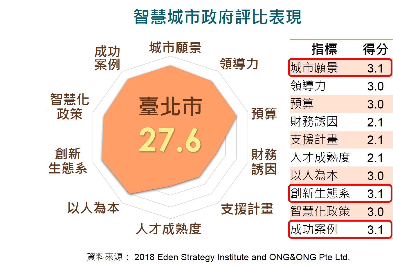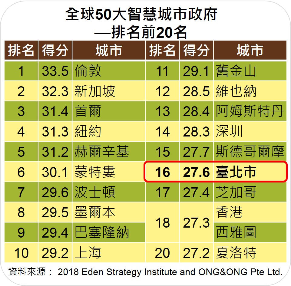 新加坡伊甸園戰略研究所(Eden Strategy Institute)於2018年7月公布全球50大智慧城市政府評比報告(Top 50 Smart City Governments),臺北市在全球140個智慧城市政府中排名第16名,為亞洲第5名,超越芝加哥、西雅圖、香港、溫哥華、柏林、東京、巴黎等知名城市。
