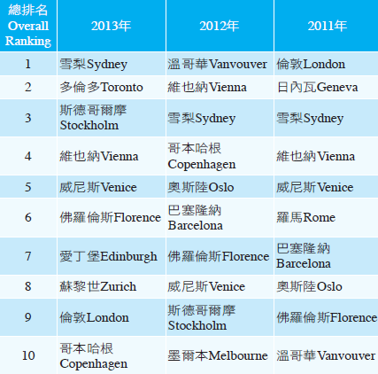 | 10 | 哥本哈根 Copenhagen | 墨爾本Melbourne | 溫哥華Vanvouver |