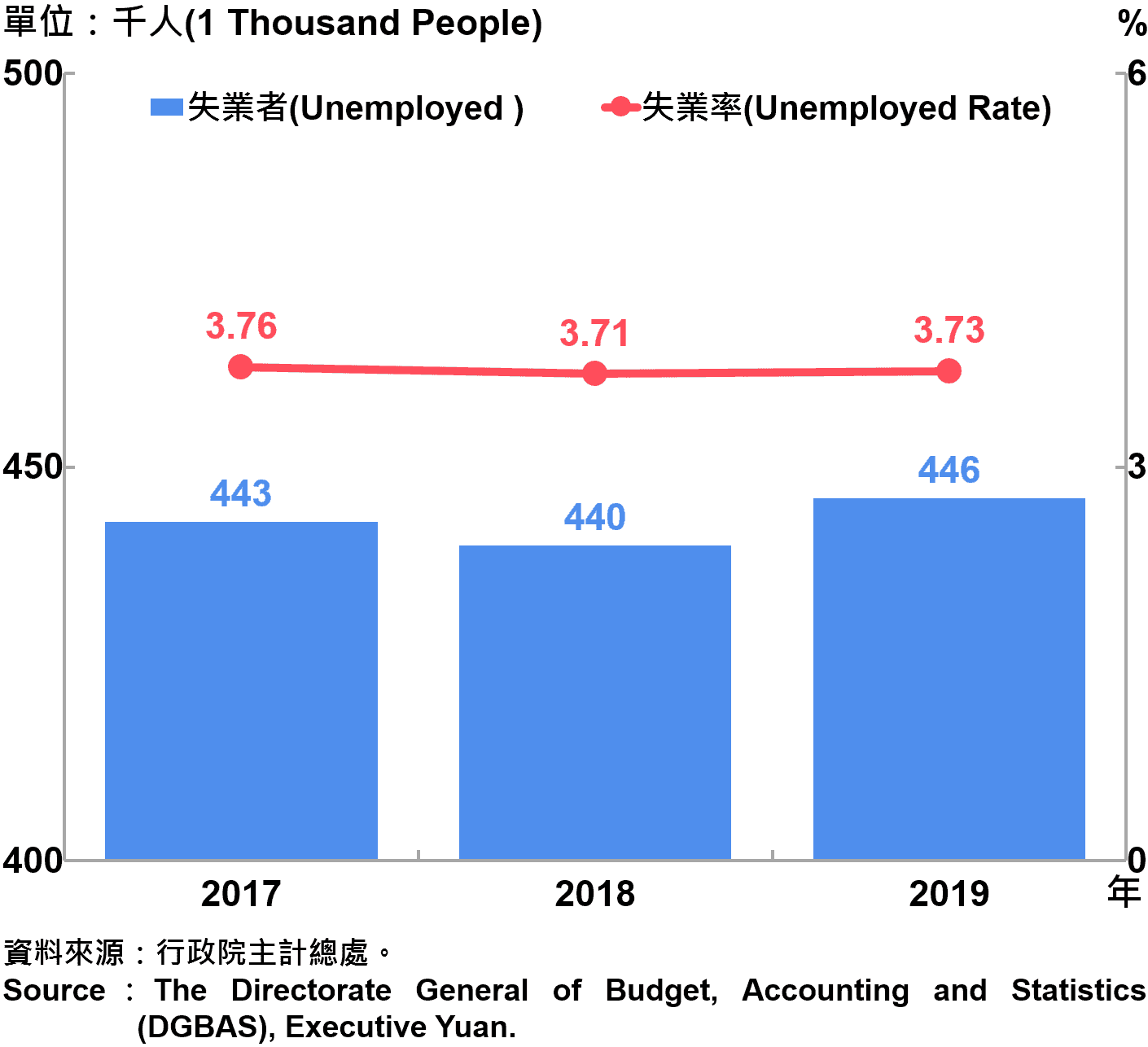 依失業狀況,平均失業人數44.6萬人,較去年同期增加0.6萬人(1.36%),平均失業率為3.73%,較去年同期增加0.02個百分點。按年齡層,15~19歲、20~24歲,失業率分別為9.22%、12.27%,多為初次尋職,且處於職場調適階段,因此失業率相對較高。25~29歲失業率為6.57%,但隨著年齡增加,失業率有呈現下降情形。按教育程度,以大學程度失業率最高(5.30%),其次為高中(職)3.51%。整體而言,失業率維持平穩,勞動力參與率提升,顯示整體勞動市場仍然持續穩定。