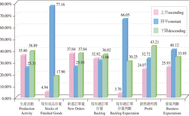 依本期刊於6月上旬至6月中旬期間所進行的臺北市企業營運信心調查結果,35.80%的製造業受訪廠商看好本期(2013年1~6月)「生產活動」,比例較前期(2012年7~12月)增加5.94個百分點,看壞比例則較前期減少0.92個百分點;此外,受訪廠商對於「現有成品存量」有77.16%表示較上半年相同,在「現有總訂單存量」看好的業者更較前期增加9.46個百分點,達32.92%,值得注意的是,有37.04%及32.92%的廠商反應新進訂單與現有總訂單數量增加,尤其在新進訂單部分增加了15.90個百分點,顯示景氣好轉幫助了廠商的接單表現;就「銷售總利潤」層面觀察,認為利潤增加的廠商比例上升7.30個百分點至24.07%,認為利潤不變的廠商比例則減少4.13個百分點達32.72%,利潤減少比例則減少3.18個百分點達43.21%,主要原因在於國內景氣持續增溫,企業主信心增加所致。觀察整體廠商對這半年來與上半年的景氣看法之比較,有40.12%的製造業廠商認為景氣持平,雖有33.95%的製造業廠商認為景氣下降,但仍有25.93%的廠商認為本期景氣上升,並較上期增加了7.95個百分點。