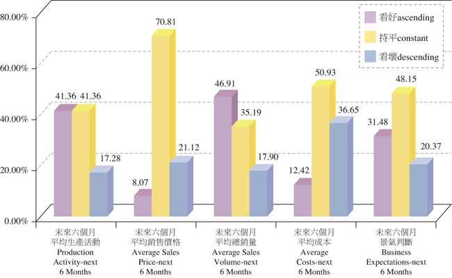 觀察整體製造業廠商對未來六個月之景氣看法,認為「未來六個月平均生產活動」將較本期上升的廠商比例增加了19.35個百分點達41.36%,認為維持不變的廠商比例則較前期減少1.98個百分點至41.36%,預期生產活動可能減少之比例僅17.28%,較前期減少17.38個百分點;在「未來六個月平均銷售價格」方面,有70.81%的廠商認為維持不變,較前期增加1.28個百分點,就「未來六個月平均總銷量」來看,有46.91%的受訪廠商認為銷售可能增加,另有35.19%的廠商認為未來六個月變化不大,而評估銷量可能減少的廠商則有17.90%;而評估「未來六個月平均成本」維持不變的廠商比例為50.93%,較上期減少6.87個百分點,而成本可能降低的廠商比例則增加1.20個百分點至36.65%,綜合上述各因素判斷,未來六個月有48.15%的廠商認為景氣不變,認為持平的比例較前期增加2.11個百分點,看好的比例較前期大增15.12個百分點至31.48%。2013年上半年,受到美國經濟仍維持擴張及日本新內閣所推出的貨幣寬鬆政策,使得國內內需表現回溫,對於臺北市製造業經濟發展有正面的激勵,對於未來整體展望企業主之信心度較前期增加(圖1~2)。