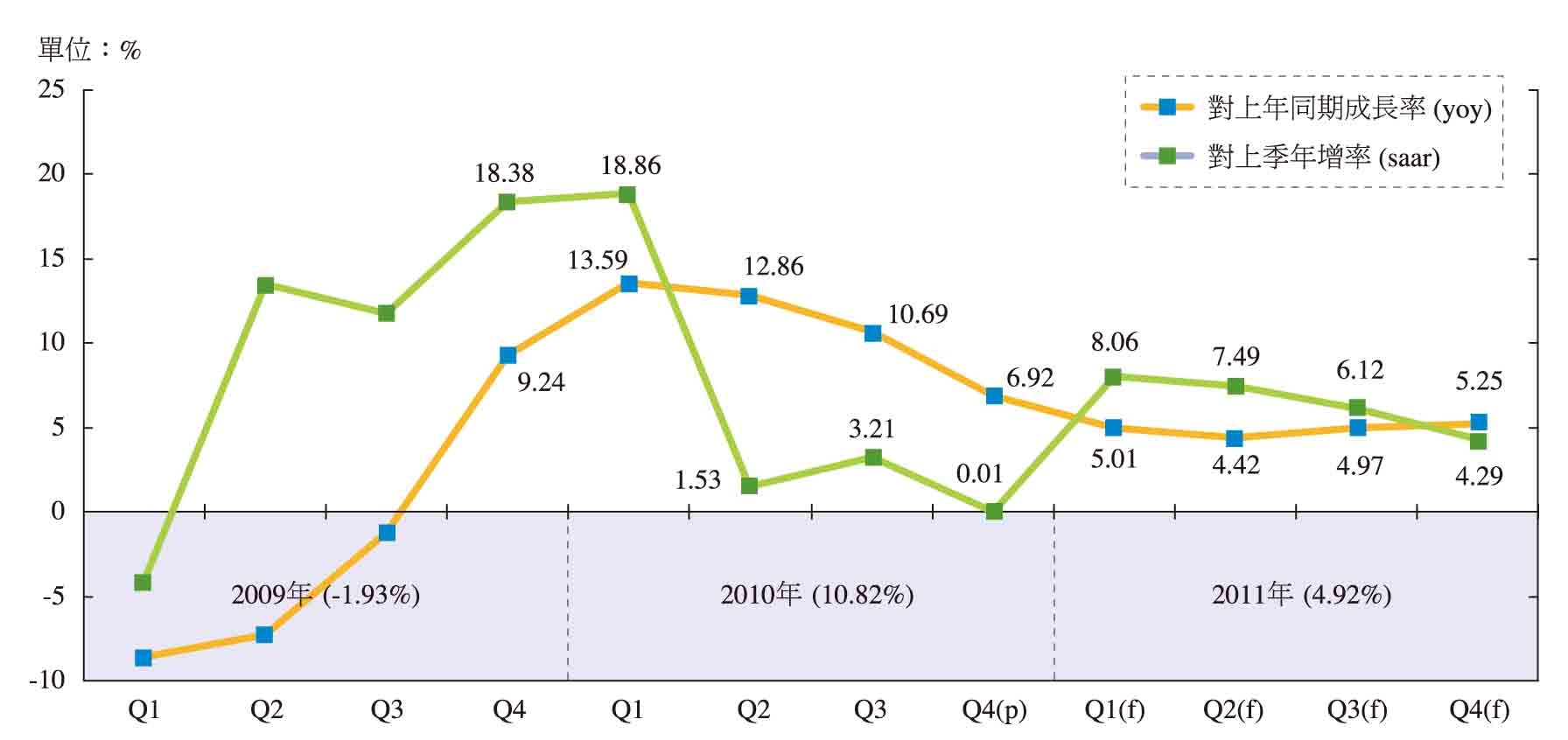 2010年第4季因全球景氣持續回升,帶動我國進出口大幅成長,主要產品接單活絡、工業生產持續攀升,民間投資與民間消費均穩健成長,失業率下降,勞動市場逐漸好轉,消費者物價相對平穩,股匯市持續揚升。
