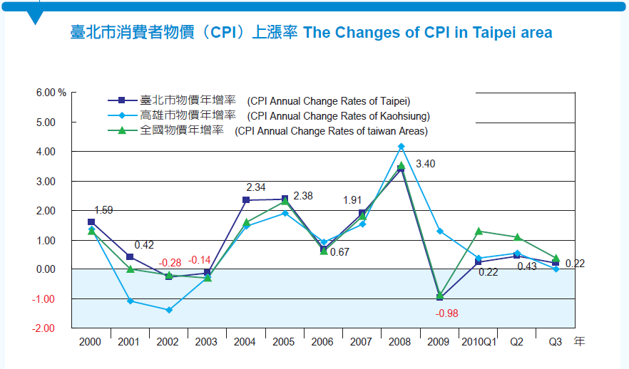 2010年第3季臺北市消費者物價指數(CPI)年增率0.22%,各類指數中,以衣著類年增率為3.94%最高,主因成衣折扣幅度較上年少,加以衣著服務及配件受國際金價飆漲,帶動國內飾金價格上揚所致。其次為雜項類年增率為1.17%,主因香菸及檳榔受菸品健康捐調漲影響;而後為交通類年增率為1.06%,主因國內油價機動調整,並連鎖帶動機票價格上漲,且交通設備因汽、機車貨物稅補貼政策結束所致。至於其他類別如居住類指數第3季成長率0.52%(其中房租指數年增率為0.09%),醫藥保健類指數第3季年增率亦僅0.34%,幾乎呈現停滯。各類別中僅教養娛樂類指數年增率於第3季呈現-0.35%,主因電子產品價格持續下探,如桌上型電腦、可攜式電腦下跌幅度皆逾20%以上。