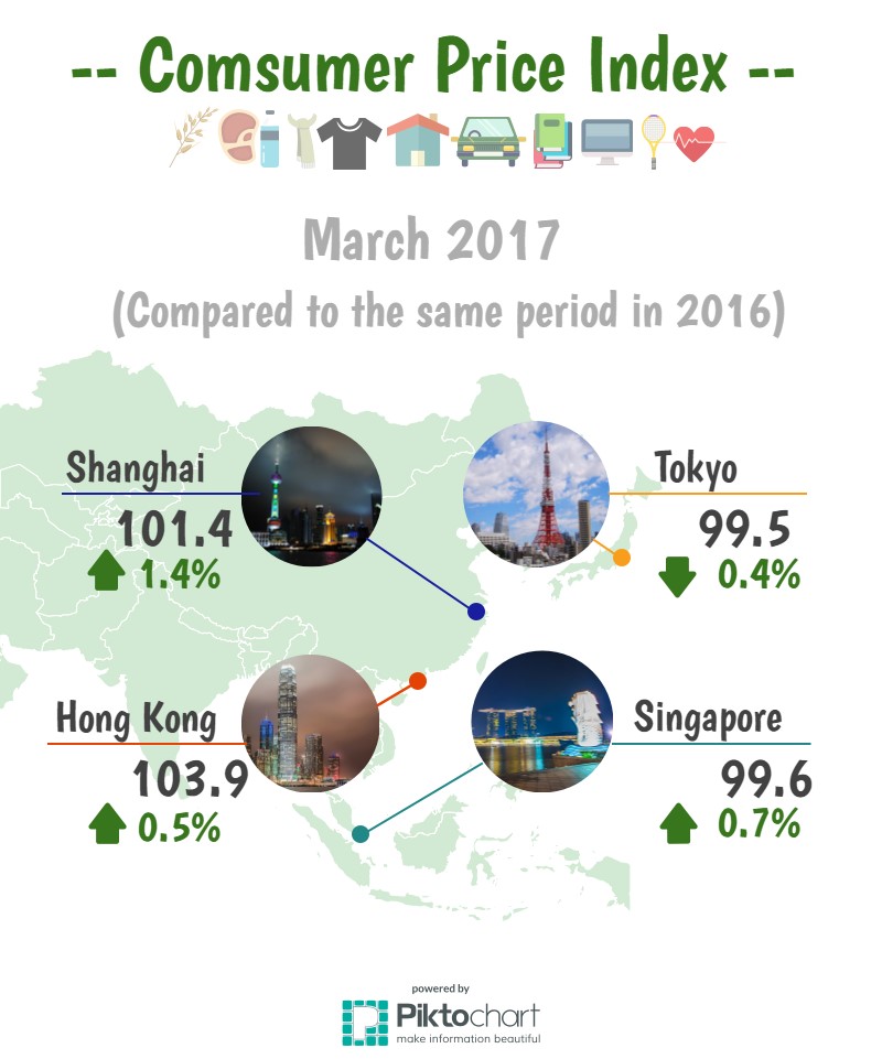 東京2017年3月工業生產指數表現與2016年同期持平;2017年3月消費者物價指數(CPI)為99.5,與2016年同期相比下降0.4%;2017年3月平均薪資較2016年同期增加1.3%,平均總工時較2016年同期減少1.9%;2017年第1季失業率為3.0%。新加坡2017年第1季GDP較2016年同期成長2.7%;2017年3月工業生產指數較2016年同期成長10.2%;2017年3月消費者物價指數為99.6,與2016年同期相比上升0.7%;2017年3月失業率為2.3%。香港2017年第1季GDP較2016年同期成長4.3%;2017年3月消費者物價指數為103.9,較2016年同期上揚0.5%;2017年第1季經季節性因素調整的失業率為3.2%。上海2017年3月消費者物價指數為101.4,與2016年同期相比上升1.4%;外商直接投資(FDI)合同項目共153項,簽訂外商直接投資合同金額為32.16億美元,較2016年同期減少69.5%。