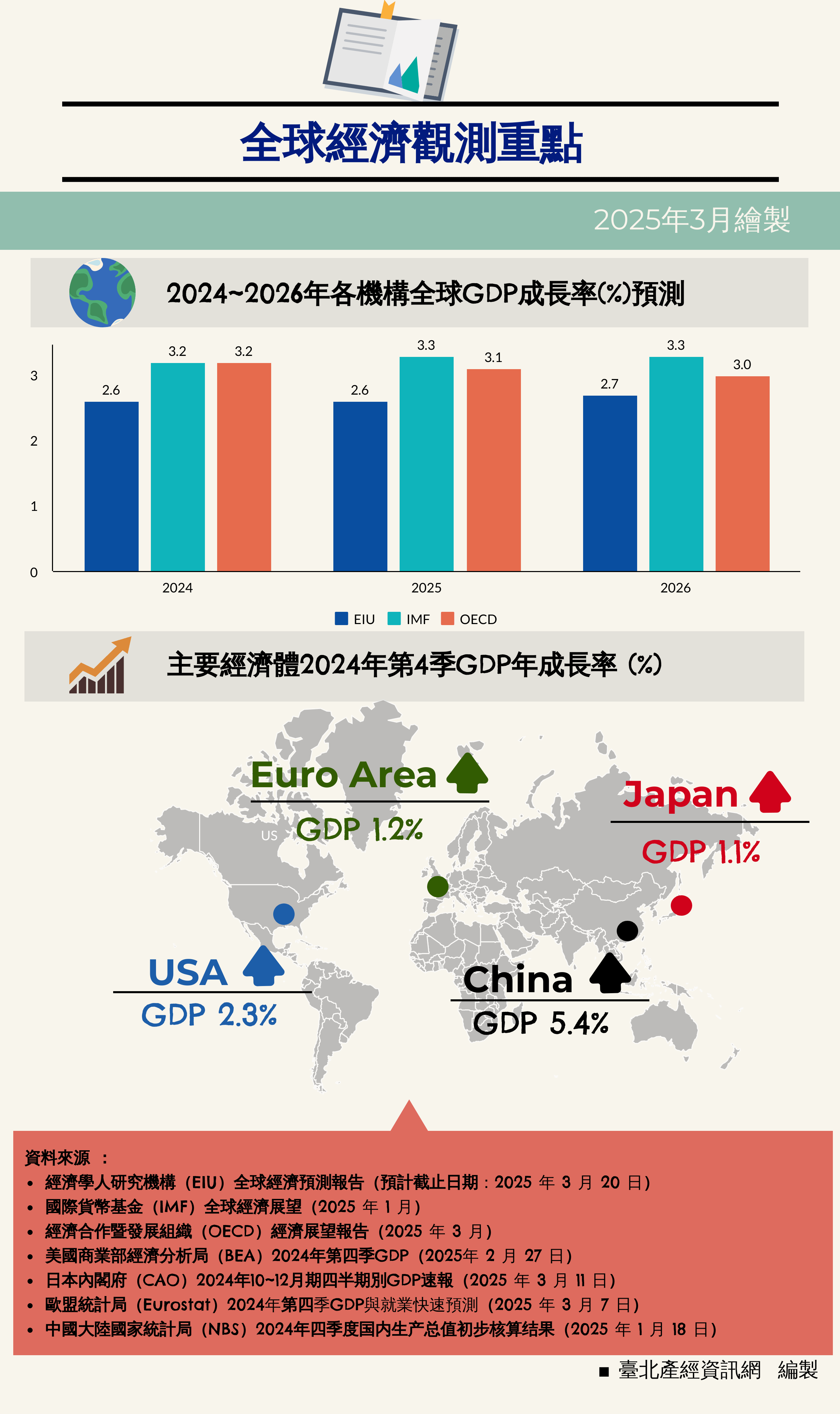 根據經濟學人研究機構(EIU)、國際貨幣基金(IMF)、經濟合作暨發展組織(OECD)等機構觀測,2024年第4季全球經濟呈現成長趨緩、通膨黏著、政策轉向的特徵。雖主要央行釋出寬鬆政策訊號,惟通膨未明顯趨穩,且貿易與地緣政治不確定性仍高,限制政策效果。儘管美國與部分新興市場維持相對穩健的成長動能,歐洲與中國大陸等經濟體表現則趨於疲弱,導致全球整體成長展望趨於保守。
