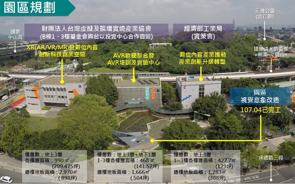 「台北數位產業園區」分為 ABC 三棟:由社團法人台灣虛擬及擴增實境產業協會(TAVAR) 取得空間營運資格,於 A 棟設立AR/VR暨數位內容創新科技創業基地,規劃為VR 直播、直播購物、網路創作 Youtuber、手機遊戲等應用項目的孵化地、VR 教育內容體驗等;B 棟由「台灣以色列投資合作中心」(TXICenter)主導,連接以色列AVR生態,以及引進全球AR/VR產業應用領導廠商「EON Reality」之教育/職訓體驗設備與培訓環境,培育國內AR/VR人才及加速產業應用,同時並引進AVR 會議設備,成立會議中心,預計籌備舉辦全球 AVR 年會; C 棟經濟部工業局數位內容產業推動辦公室進駐,透過聚焦數位內容、體感科技,以及跨域新型態智慧物聯等關鍵主題之技術支援、創新促進與國際連結的創新場域。