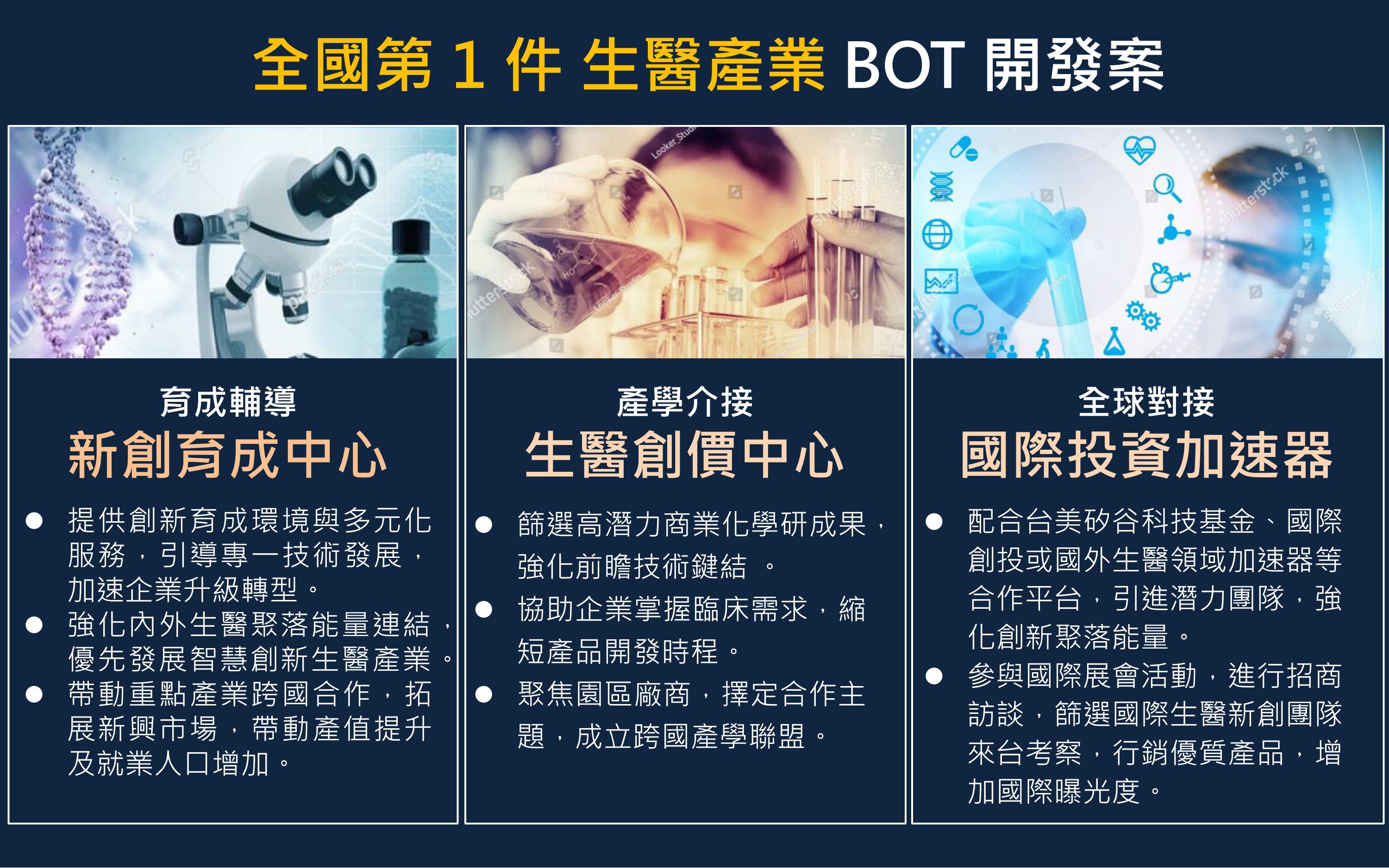 本計畫為全國首件聚焦生醫產業的BOT開發案,預期未來將以育成輔導、產學介接、全球對接為營運目標,透過新創育成中心,加速企業升級轉型,重點發展智慧創新生醫產業;篩選高潛力商業化學研成果協助企業掌握臨床需求,縮短產品開發時程;引進國外優質潛力團隊,強化創新聚落能量,積極參與國際展會活動,以提升國際能見度。藉由公部門與民間機構合作,補足生技企業對於空間量體的需求,滿足生技企業於本市研發、試量產的期待。整體開發案期程完成BOT簽約後開始興建,預計2021年正式啟動營運,契約期間為50年,預估可為市府整體財務收益至少68億元,可創造3,100名就業機會,並帶動生技產業年產值超過500億元的經濟效益。