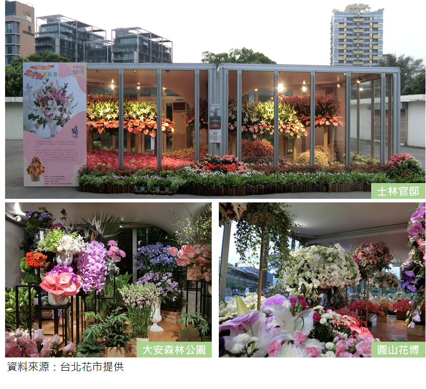 受到疫情影響,許多大型活動規模縮小或取消,非民生必需品的花卉出口訂單大幅減少,內銷也萎縮,造成產銷上的壓力。為此,臺北市政府與農糧署、台北花市合作,於4月16日至5月27日推出「花卉健康療育展示計畫」,分別在士林官邸、大安森林公園及花博公園戶外空間,以「花卉櫥窗玻璃屋」做為展出方式,避免群聚賞花及天候影響。此外,為了讓民眾感受不同的空間氛圍,台北花市亦邀請IFD 財團法人國際花藝教育研究文教基金會、文華花苑、台北花市花藝顧問三組花藝團隊分別於三地進行布置,主力花卉包括國產切花百合、洋桔梗、非洲菊、火鶴、多花菊,並搭配百貨公司櫥窗換季概念,每2週進行主題更換,如「美麗花時間」、「花馨暖暖」、「微光花語」、「花入心田」、「花綠滿屋」、「花朵盛宴」等,在防疫期間提供民眾戶外散心的休憩空間,擺放的花材亦可在花店購買,期望提供療癒心靈、提升花卉買氣的效益。