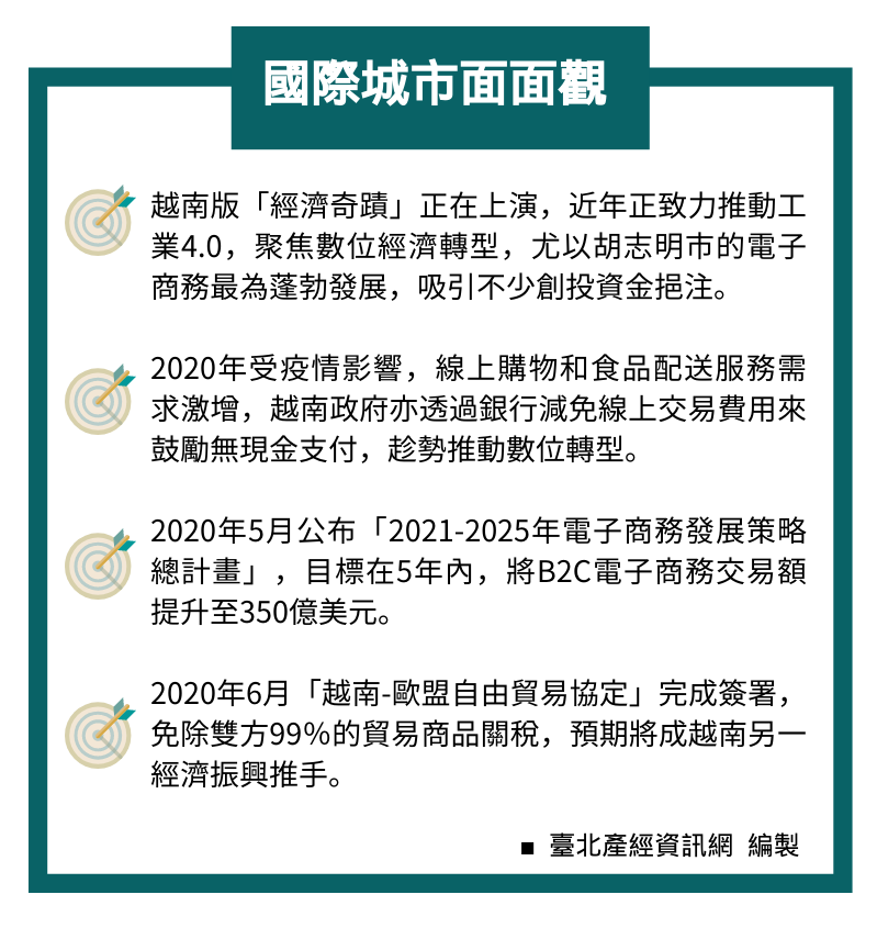 越南近年致力推動工業4.0,聚焦數位經濟轉型,其中以胡志明市的科技建設和商業環境最為卓越,電子商務尤其蓬勃發展,吸引不少創投資金進駐。新冠肺炎疫情席捲全球,線上購物和食品配送服務的需求激增,越南政府亦透過銀行減免線上交易費用來鼓勵無現金支付,電子商務不僅撐住國內消費力,也被視為後疫情時代裡重啟經濟的領頭羊。越南政府於2020年5月公布「2021-2025年電子商務發展策略總計畫」,致力於完善電子商務法規及相關基礎建設,並深入教育層面,目標為5年內,將電子商務交易額提升至350億美元。值得關注的是,2020年6月「越南-歐盟自由貿易協定」完成簽署,免除雙方99%的貿易商品關稅,預期將成越南另一經濟振興推手。