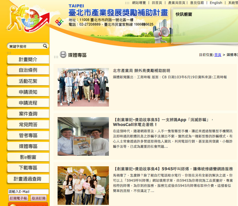臺北市政府多年來提供各種創業資源,鼓勵年輕創業家勇於落實夢想、創造商機,並積極推辦各項產業發展獎勵及補助,以完備產業發展政策工具,並已完成修正「臺北市產業發展自治條例」,不但提高創新研發計畫補助金額,更增訂創業、創新育成及品牌建立等計畫補助,鼓勵青年開創事業、產業創新育成、提升企業研發投入,乃至企業發展品牌與通路,以及獎勵企業創新投資於臺北等,期許為臺北市更多創業者創造最大效益與貢獻。