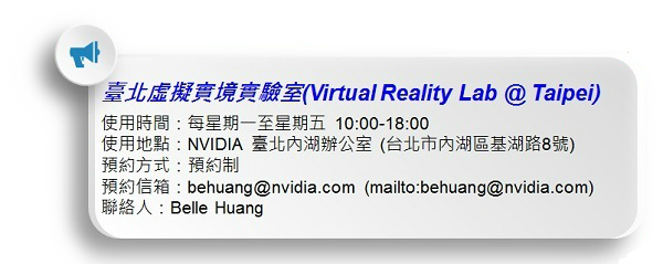 由於NVIDIA在臺灣經營軟硬體科技市場多年,觀察新創公司的創意想法非常活躍,但無法負擔高效能的硬體設備,使其開發過程備受限制。因此,NVIDIA 在這座虛擬實境實驗室 提供免費技術指導、 NVIDIA VRWorks 基本軟體支援服務 ,現場並配有 HTC Vive 及 Oculus 等頭戴裝置,以及 NVIDIA VR Ready 之硬體設備供開發人員測試。未來NVIDIA也將持續添購最新的VR硬體設備,目前實驗室採預約制,歡迎有興趣投入開發VR軟體、遊戲與服務的新創業者多加利用。而臺北市政府作為新創業者的強力後盾,未來也會持續擴展更多元的創業資源,為業者尋求更多的媒合機會,此外亦提供多項獎補助資源,鼓勵新創業者投入新興技術領域的研發,期開發出創新應用服務,並推向國際市場。