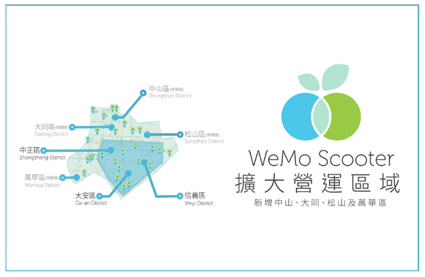 WeMo Scooter目前臺北市營運範圍包含中正、大安、信義、中山、松山、萬華、大同區,預計9月中旬陸續擴大營運區域,先開放內湖,再增加南港、士林等地區,年底前營運範圍將涵蓋大台北中心地區,全力打造臺北市為智慧綠能交通城市。